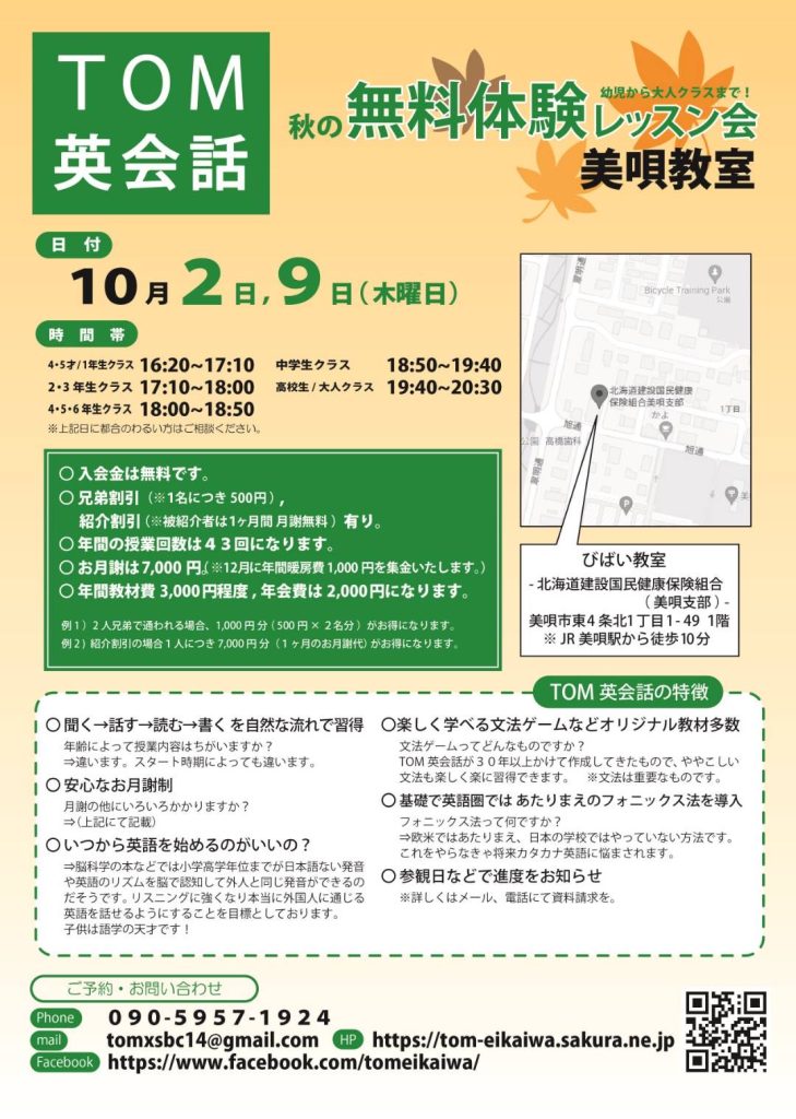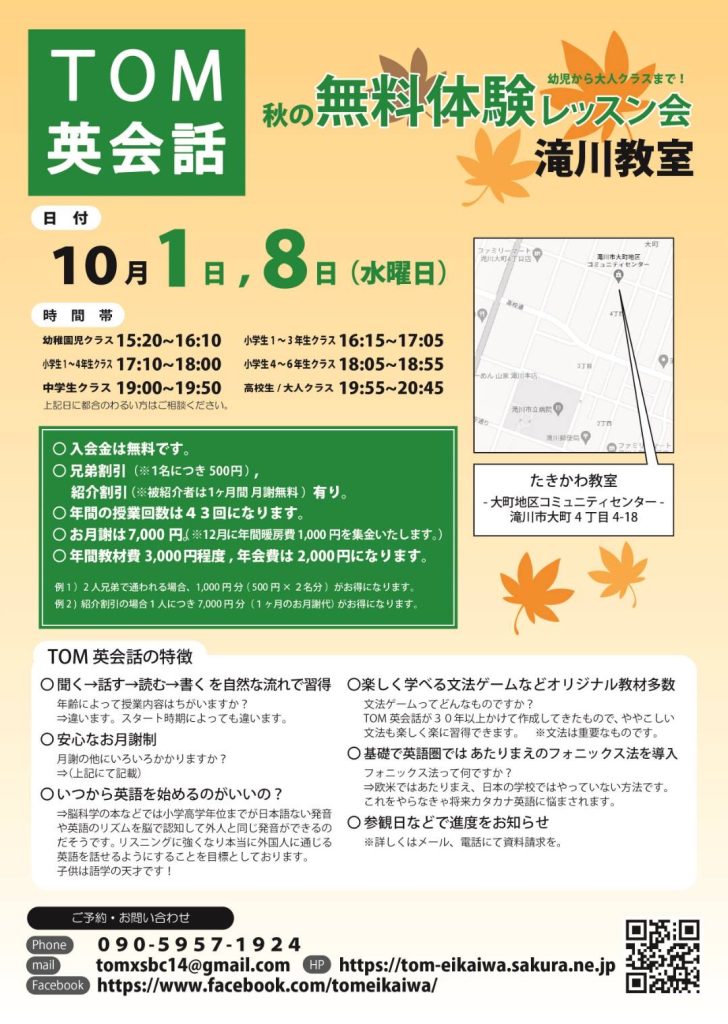 TOM英会話 滝川教室、美唄教室で秋の無料体験レッスンを開催致します。滝川は毎週水曜日、美唄は毎週木曜日。今年から授業で英語が始まった小学3年生、本格的な英語の授業がスタートした中学1年生、高校入試・大学入試・英検・TOEICなどのリスニング・スピーキングテスト対策をしたい方、そして下半期心機一転英会話をスタートしてみたい方など、ぜひTom先生と一緒に週1回英語を勉強してみませんか?